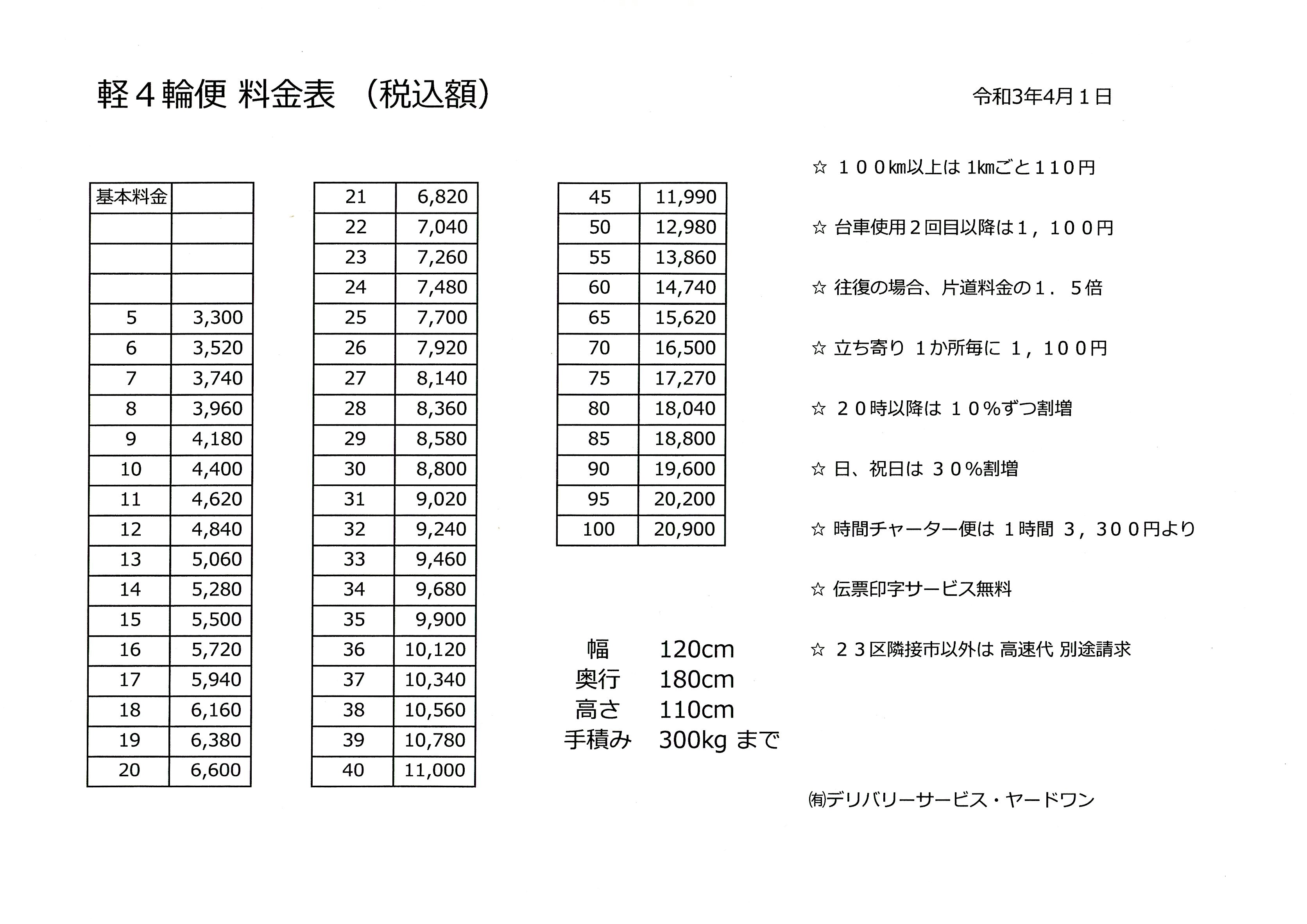 最寄のドライバーが迅速にお伺いし、そのままお届け致します。 軽四輪便 料金表(スポット)